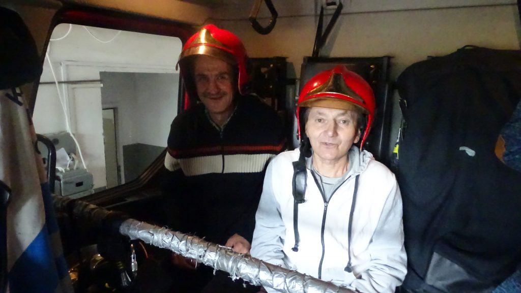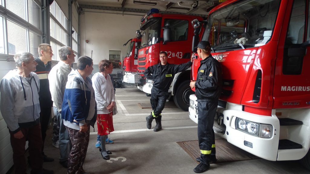 W dniu 14.06.2018 r. pojechaliśmy z wizytą do Komendy Miejskiej Straży Pożarnej w Koszalinie. Celem było spotkanie się z pracownikami straży, poznanie i zrozumienie specyfiki ich pracy, obejrzenie sprzętu, jakim straż dysponuje na co dzień. Strażacy zaprezentowali sprzęt pożarniczy stanowiący wyposażenie jednostki. Nasi Uczestnicy oglądali wozy strażackie i sprzęt do gaszenia pożarów. Chętni mogli usiąść za kierownicą, przymierzyć hełm strażacki. W formie pogadanki i prezentacji uczestnicy zapoznali się z zadaniami realizowanymi przez straż pożarną, sposobami alarmowania oraz zachowania się w przypadku zagrożenia. Wszyscy z wielkim zaciekawieniem wysłuchali opowieści o akcjach ratowniczo – gaśniczych. Na zakończenie wręczyliśmy Dowódcy Zmiany obraz wykonany przez Terapię Zajęciową w Naszym Domu. Bardzo dziękujemy za tak miłe przyjęcie. Do zobaczenia.