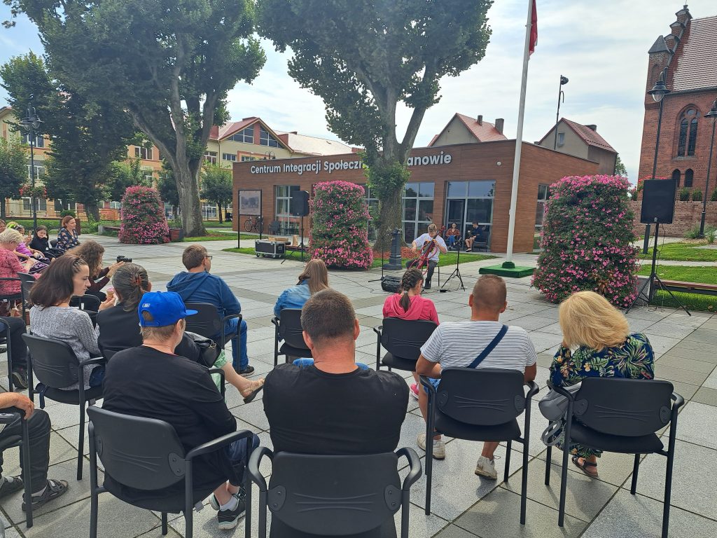 Koncert wiolonczeli na Rynku Miejskim w Polanowie.