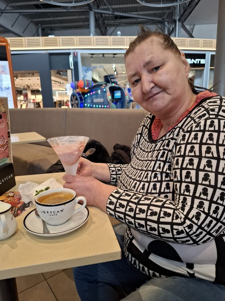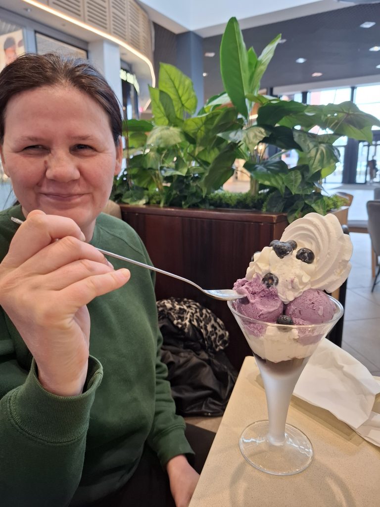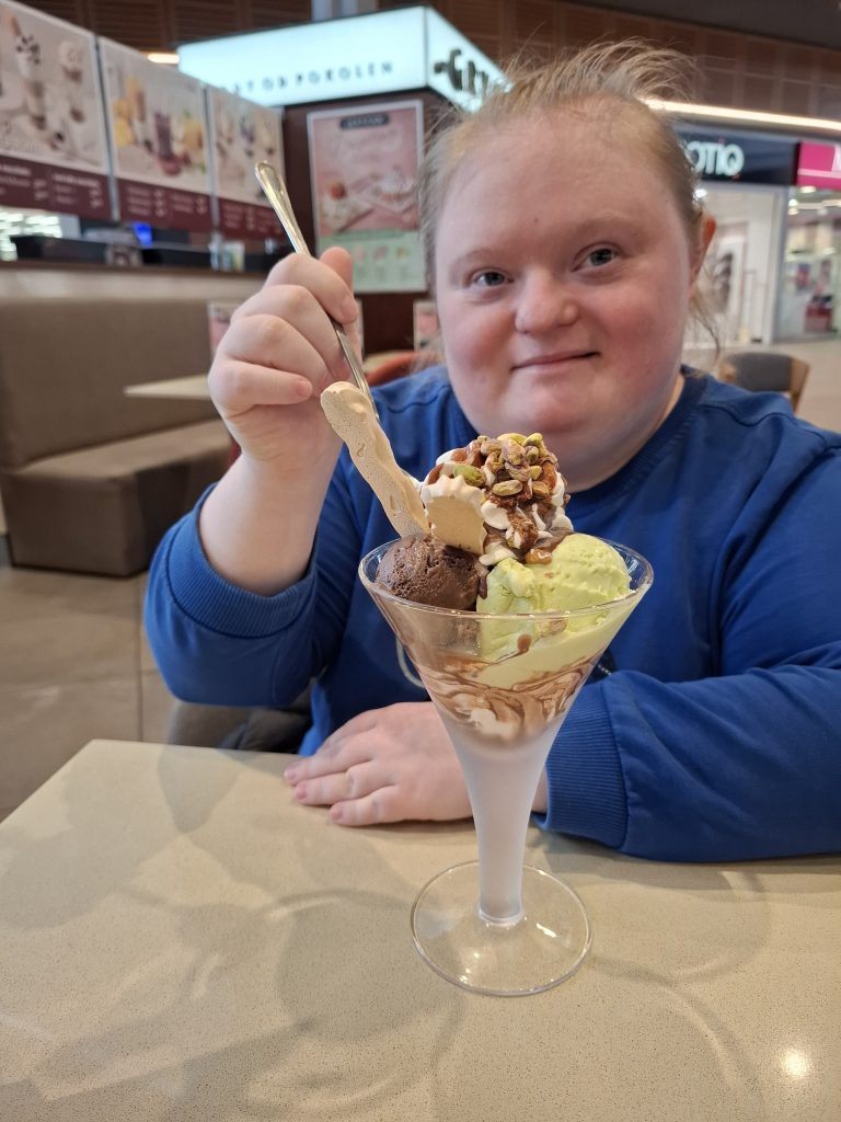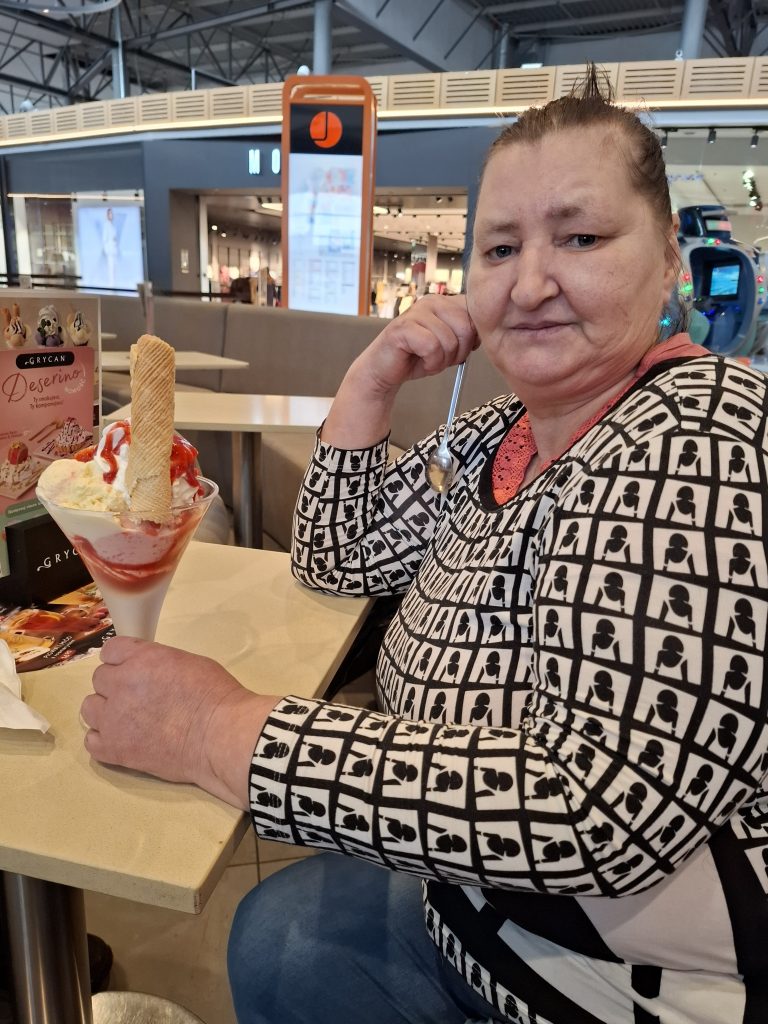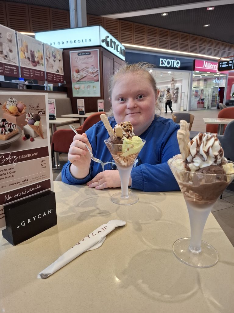Dzisiaj Grażyna, Karolina, Weronika i Marian pojechali do Centrum Handlowego Jantar w Słupsku. W kawiarni Grycan zamówiliśmy puchary deserów lodowych, każdy z nas wybrał inny smak: pistacjowy, słony karmel, malinowy i borówkowy![]()